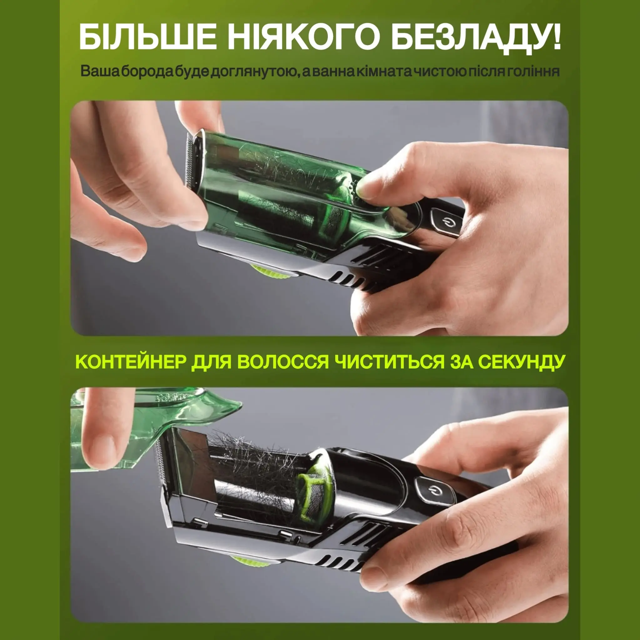 Кожного разу при голінні вашим звичайним тримером залишається купа волосся, яке розлітається по всій ванній кімнаті, забивається злив. Таких проблем більше не буде з вакуумним тримером BORODAR™-більше ніякого безладу!