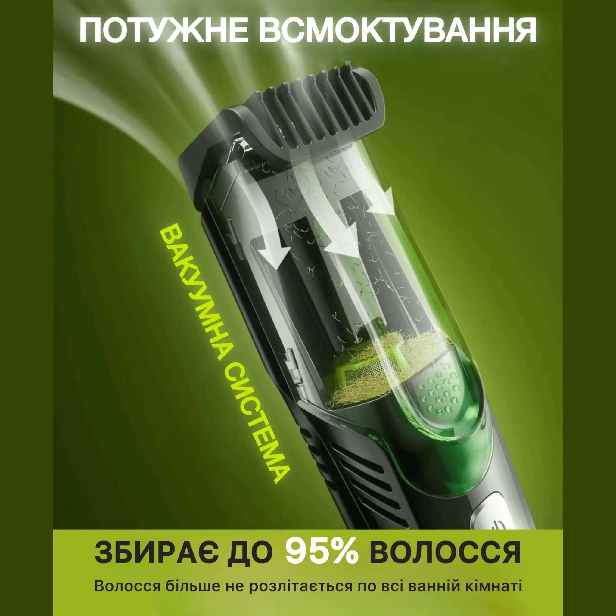 До 95% зрізаного волосся потрапляє у вбудований контейнер одразу за допомогою потужної вакуумної системи всмоктування вбудованої в тример BORODAR™. Ніякого розкиданого волосся — лише охайний результат.